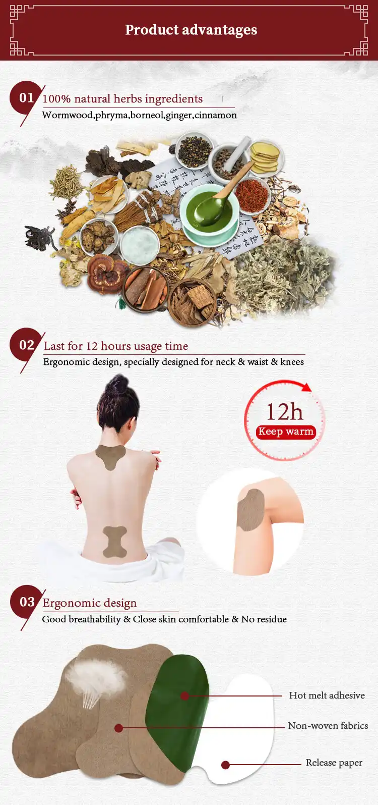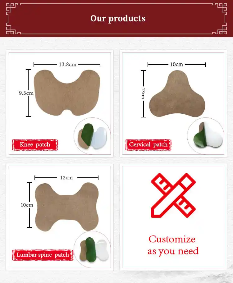 Nuestro Parche para aliviar el dolor de rodilla está diseñado para proporcionar alivio profundo y calmante Para el dolor de rodilla, la artritis y la rigidez. Infundido con extractos de hierbas naturales y terapia de calor , ayuda a mejorar la circulación sanguínea, reducir la inflamación y aliviar la tensión muscular en la zona de la rodilla. El Material transpirable y agradable para la piel. garantiza la comodidad y el parche proporciona hasta 12 horas de alivio continuo, lo que lo hace perfecto para el uso diario.